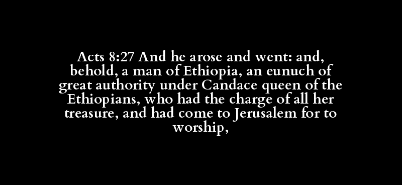 Acts 8:27 And he arose and went: and, behold, a man of Ethiopia, an eunuch of great authority under Candace queen of the Ethiopians, who had the charge of all her treasure, and had come to Jerusalem for to worship,
