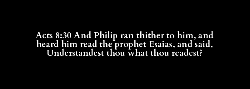 Acts 8:30 And Philip ran thither to him, and heard him read the prophet Esaias, and said, Understandest thou what thou readest?
