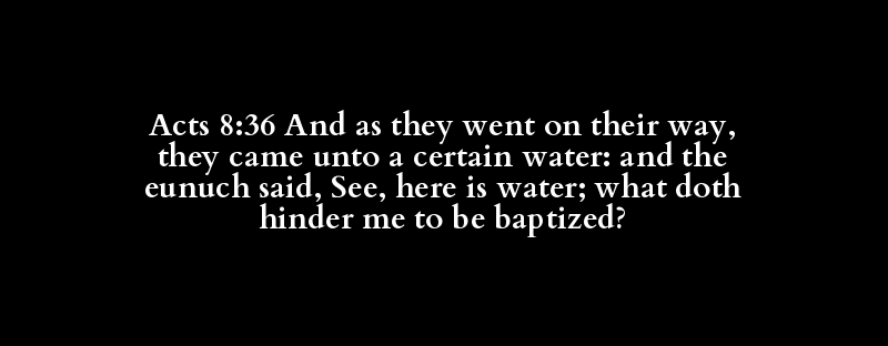Acts 8:36 And as they went on their way, they came unto a certain water: and the eunuch said, See, here is water; what doth hinder me to be baptized?