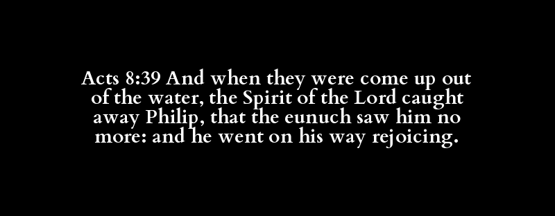 | [de] | [hote] | [anabaino] | [ek] | [hudor] | [pneuma] | [kurios] | [harpazo] | [Philippos] | [kai] | [eunouchos] | [eido] | [ou] | [autos] | [ouketi] | [gar] | [poreuomai] | [autos] | [hodos] | [chairo] |
