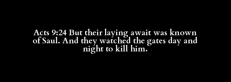 Acts 9:24 But their laying await was known of Saul. And they watched the gates day and night to kill him.