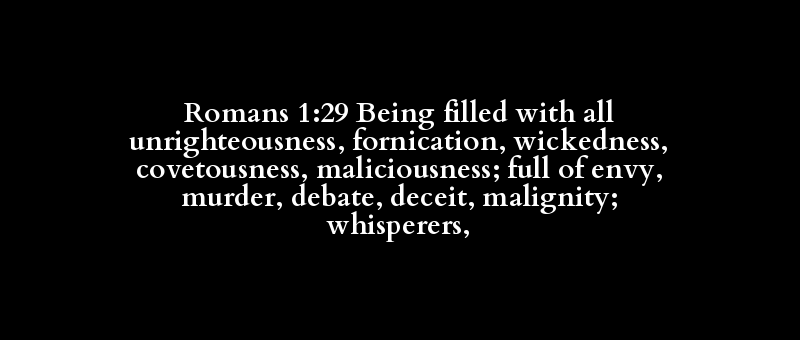 Romans 1:29 Being filled with all unrighteousness, fornication, wickedness, covetousness, maliciousness; full of envy, murder, debate, deceit, malignity; whisperers,