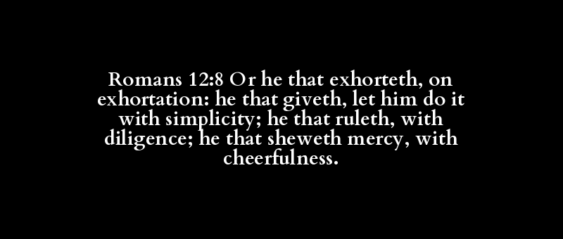 Romans 12:8 Or he that exhorteth, on exhortation: he that giveth, let him do it with simplicity; he that ruleth, with diligence; he that sheweth mercy, with cheerfulness.