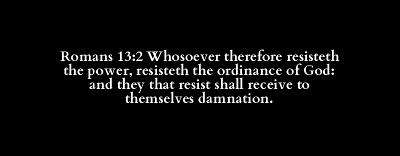 Romans 13:2 Whosoever therefore resisteth the power, resisteth the ordinance of God: and they that resist shall receive to themselves damnation.