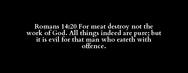 | because, for (cause, sake), (where-)fo.. | meat, victuals | destroy, dissolve, be guest, lodge, co.. | any but (that), X forbear, + God forbi.. | deed, doing, labour, work | God, god(-ly, -ward), | all (manner of, means), alway(-s), any.. | even, indeed, so, some, truly, verily | clean, clear, pure | and, but (even), howbeit, indeed, nay,.. | bad, evil, harm, ill, noisome, wicked | human/people | devour, eat, live | after, always, among, at, to avoid, be.. | offence, stumbling(-block, -stone |