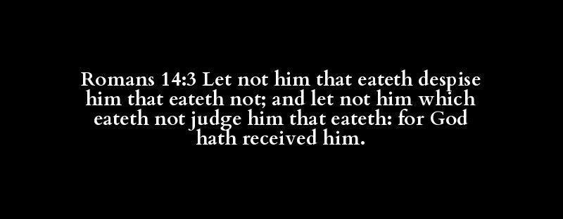 Romans 14:3 Let not him that eateth despise him that eateth not; and let not him which eateth not judge him that eateth: for God hath received him.
