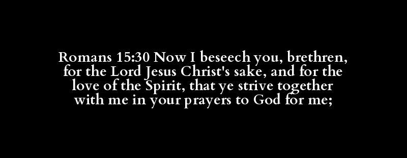 Romans 15:30 Now I beseech you, brethren, for the Lord Jesus Christ's sake, and for the love of the Spirit, that ye strive together with me in your prayers to God for me;