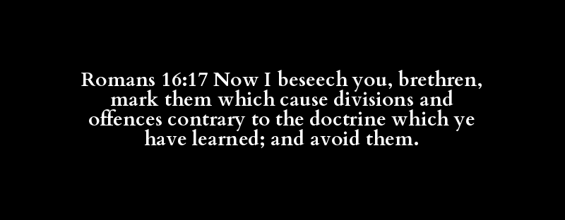 Romans 16:17 Now I beseech you, brethren, mark them which cause divisions and offences contrary to the doctrine which ye have learned; and avoid them.