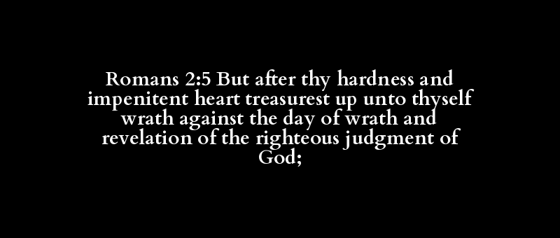 Romans 2:5 But after thy hardness and impenitent heart treasurest up unto thyself wrath against the day of wrath and revelation of the righteous judgment of God;