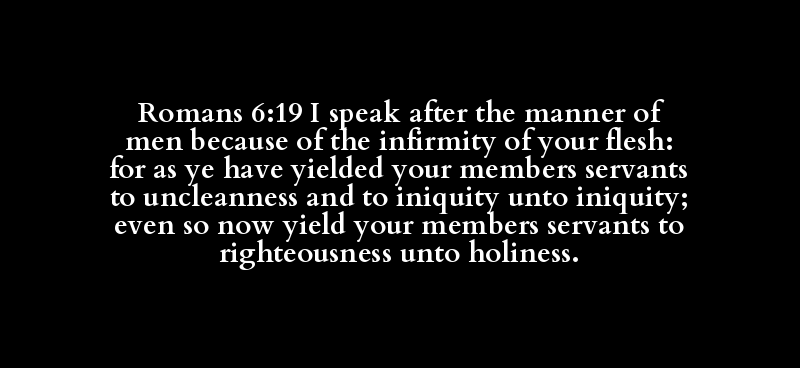 | ask, bid, boast, call, describe, give .. | human, common to man, man(-kind), (man.. | after, always, among, at, to avoid, be.. | disease, infirmity, sickness, weakness | ye, you, your (own, -selves | carnal(-ly), + carnally minded, flesh(.. | and, as, because (that), but, even, fo.. | even, like) as | assist, bring before, command, commend.. | ye, you, your (own, -selves | member | bond(-man), servant | uncleanness | and, also, both, but, even, for, if, o.. | iniquity, X transgress(-ion of) the la.. | abundantly, against, among, as, at, (b.. | iniquity, X transgress(-ion of) the la.. | after that, after (in) this manner, as.. | henceforth, + hereafter, of late, soon.. | assist, bring before, command, commend.. | ye, you, your (own, -selves | member | bond(-man), servant | righteousness | abundantly, against, among, as, at, (b.. | holiness, sanctification |