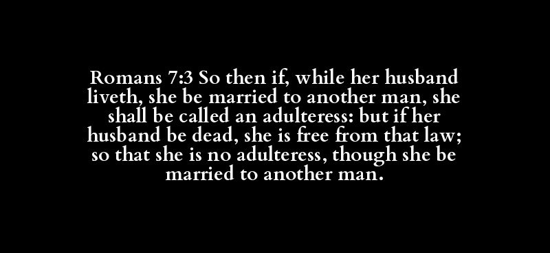 Romans 7:3 So then if, while her husband liveth, she be married to another man, she shall be called an adulteress: but if her husband be dead, she is free from that law; so that she is no adulteress, though she be married to another man.