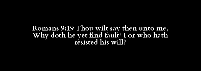 Romans 9:19 Thou wilt say then unto me, Why doth he yet find fault? For who hath resisted his will?