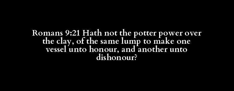 Romans 9:21 Hath not the potter power over the clay, of the same lump to make one vessel unto honour, and another unto dishonour?