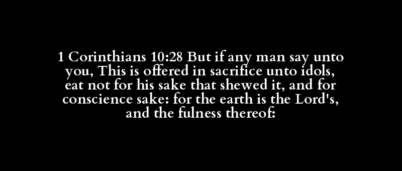 1 Corinthians 10:28 But if any man say unto you, This is offered in sacrifice unto idols, eat not for his sake that shewed it, and for conscience sake: for the earth is the Lord's, and the fulness thereof: