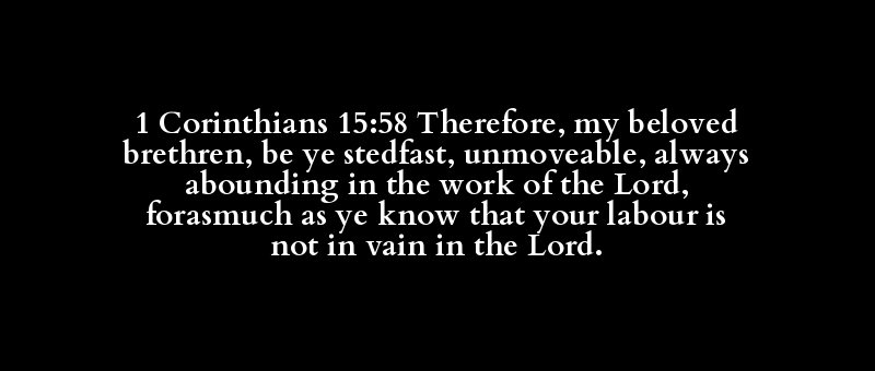 1 Corinthians 15:58 Therefore, my beloved brethren, be ye stedfast, unmoveable, always abounding in the work of the Lord, forasmuch as ye know that your labour is not in vain in the Lord.
