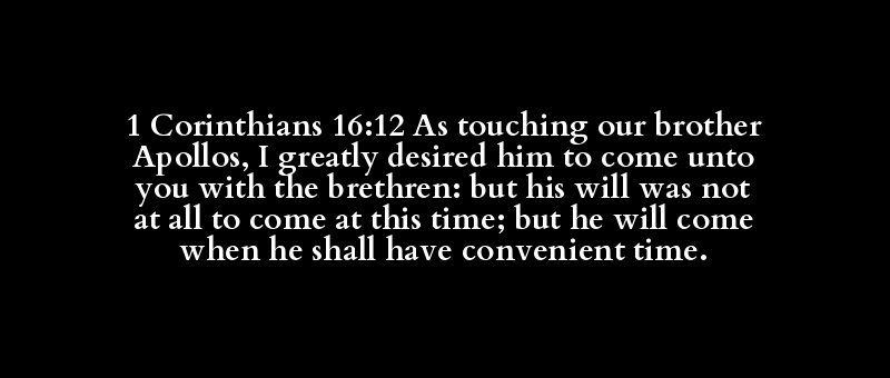 | δέ | περί | ἀδελφός | Ἀπολλῶς | παρακαλέω | πολύς | παρακαλέω | αὐτός | ἵνα | ἔρχομαι | πρός | ὑμᾶς | μετά | ἀδελφός | καί | θέλημα | ἦν | οὐ | πάντως | ἵνα | ἔρχομαι | νῦν | δέ | ἔρχομαι | ὅταν | εὐκαιρέω |