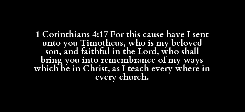 1 Corinthians 4:17 For this cause have I sent unto you Timotheus, who is my beloved son, and faithful in the Lord, who shall bring you into remembrance of my ways which be in Christ, as I teach every where in every church.