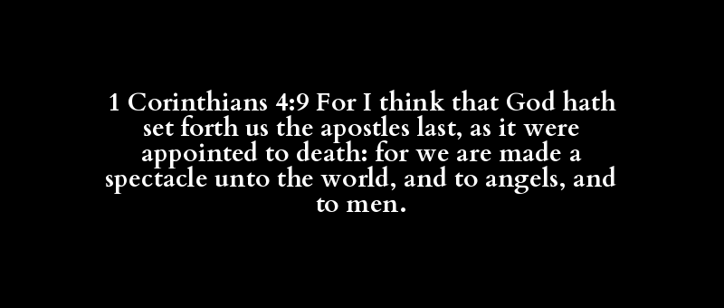 1 Corinthians 4:9 For I think that God hath set forth us the apostles last, as it were appointed to death: for we are made a spectacle unto the world, and to angels, and to men.