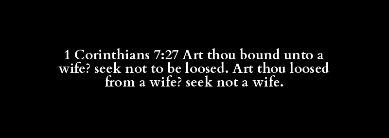 1 Corinthians 7:27 Art thou bound unto a wife? seek not to be loosed. Art thou loosed from a wife? seek not a wife.