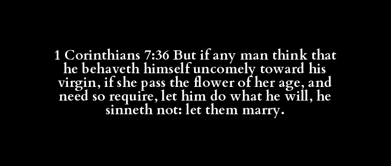 1 Corinthians 7:36 But if any man think that he behaveth himself uncomely toward his virgin, if she pass the flower of her age, and need so require, let him do what he will, he sinneth not: let them marry.