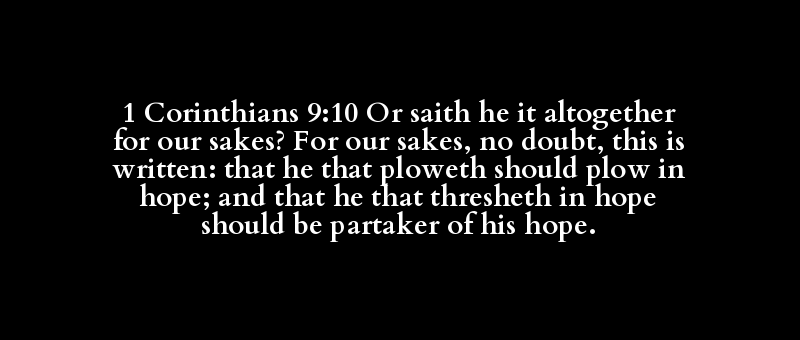| ἤ | λέγω | πάντως | διά | ἡμᾶς | διά | διά | ἡμᾶς | διά | γάρ | γράφω | ὅτι | ἀροτριόω | ὀφείλω | ἀροτριόω | ἐπί | ἐλπίς | καί | ἀλοάω | ἐλπίς | μετέχω | ἐπί | αὐτός | ἐλπίς |