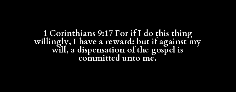 1 Corinthians 9:17 For if I do this thing willingly, I have a reward: but if against my will, a dispensation of the gospel is committed unto me.