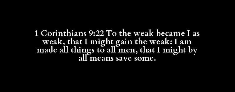 1 Corinthians 9:22 To the weak became I as weak, that I might gain the weak: I am made all things to all men, that I might by all means save some.