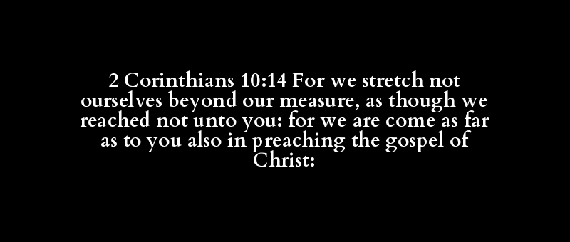 2 Corinthians 10:14 For we stretch not ourselves beyond our measure, as though we reached not unto you: for we are come as far as to you also in preaching the gospel of Christ: