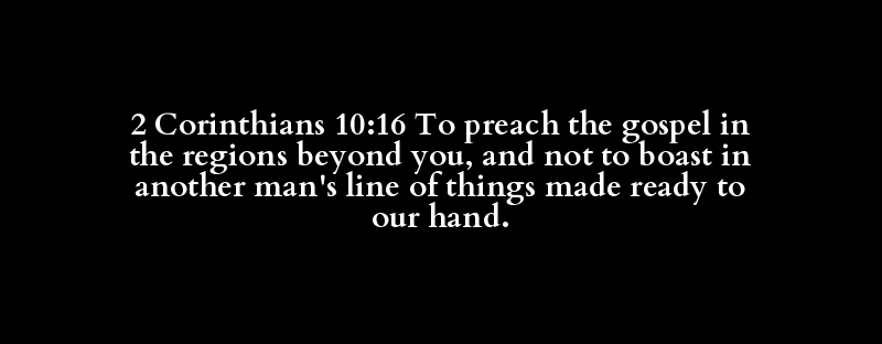 2 Corinthians 10:16 To preach the gospel in the regions beyond you, and not to boast in another man's line of things made ready to our hand.