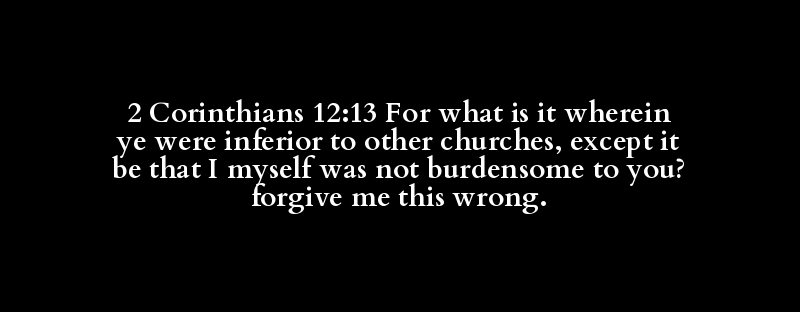 | and, as, because (that), but, even, fo.. | every man, how (much), + no(-ne, -thin.. | are, be(-long), call, X can(-not), com.. | one, (an-, the) other, some, that, wha.. | be inferior, overcome | exceeding, abundantly) above, in (on).. | other, which remain, remnant, residue,.. | assembly, church | but, except (that), if not, more than,.. | as concerning that, as though, because.. | I, me | her, it(-self), one, the other, (mine).. | be burdensome (chargeable | long, nay, neither, never, no (X man).. | be burdensome (chargeable | ye, you, your (own, -selves | deliver, (frankly) forgive, (freely) g.. | I, me, mine, my | her, + hereof, it, that, + thereby, th.. | iniquity, unjust, unrighteousness, wrong |