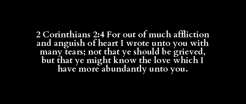 2 Corinthians 2:4 For out of much affliction and anguish of heart I wrote unto you with many tears; not that ye should be grieved, but that ye might know the love which I have more abundantly unto you.