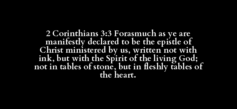 2 Corinthians 3:3 Forasmuch as ye are manifestly declared to be the epistle of Christ ministered by us, written not with ink, but with the Spirit of the living God; not in tables of stone, but in fleshly tables of the heart.