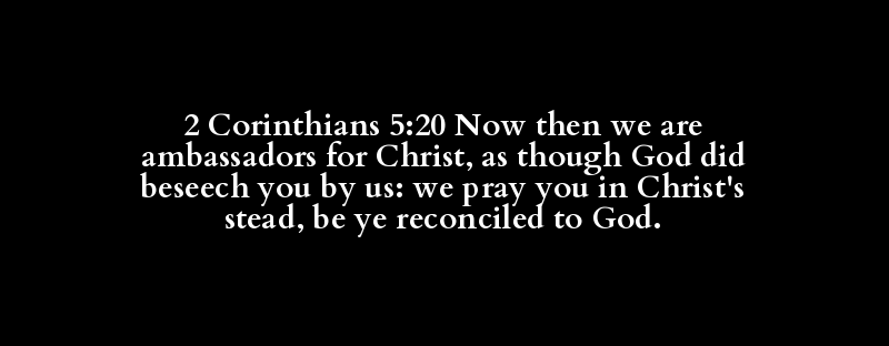 2 Corinthians 5:20 Now then we are ambassadors for Christ, as though God did beseech you by us: we pray you in Christ's stead, be ye reconciled to God.