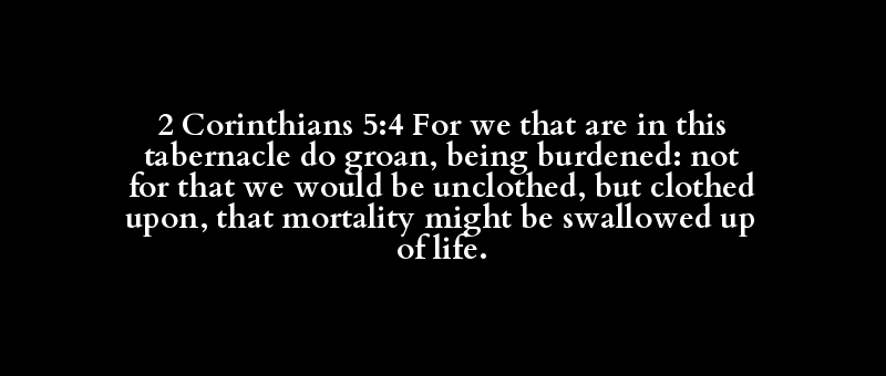 2 Corinthians 5:4 For we that are in this tabernacle do groan, being burdened: not for that we would be unclothed, but clothed upon, that mortality might be swallowed up of life.