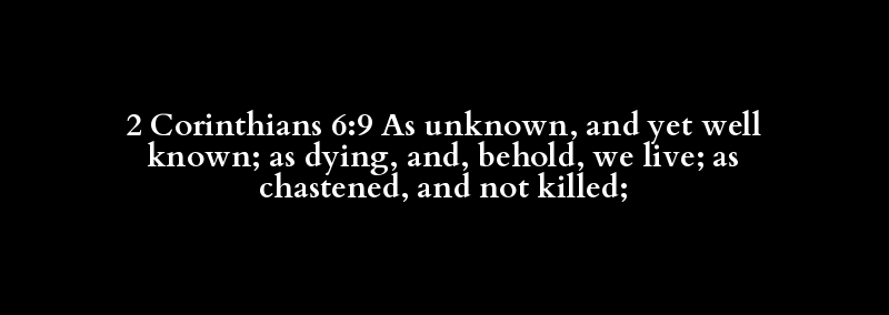 2 Corinthians 6:9 As unknown, and yet well known; as dying, and, behold, we live; as chastened, and not killed;