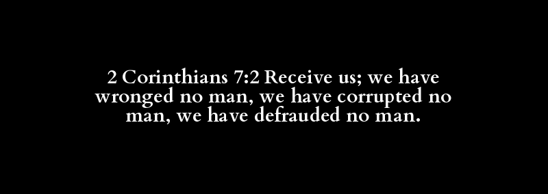 2 Corinthians 7:2 Receive us; we have wronged no man, we have corrupted no man, we have defrauded no man.