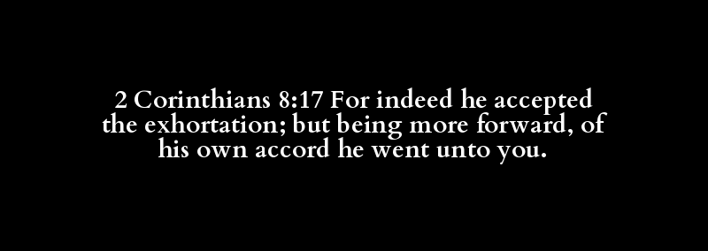2 Corinthians 8:17 For indeed he accepted the exhortation; but being more forward, of his own accord he went unto you.