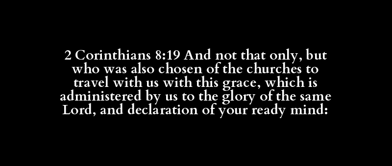 2 Corinthians 8:19 And not that only, but who was also chosen of the churches to travel with us with this grace, which is administered by us to the glory of the same Lord, and declaration of your ready mind:
