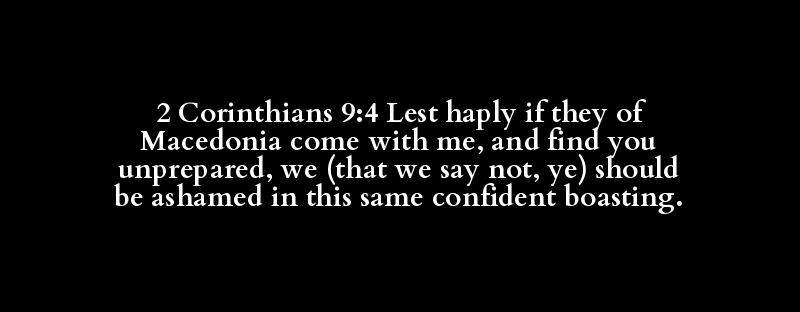 | lest (by any means, by some means, hap.. | haply, by any (some) means, perhaps | before, but, except, (and) if, (if) so.. | of Macedonia, Macedonian | accompany, appear, bring, come, enter,.. | beside, with | I, me, mine, my | and, also, both, but, even, for, if, o.. | find, get, obtain, perceive, see | ye, you (+ -ward), your (+ own | unprepared | us, we (ourselves | albeit not, lest, that, no(-t, -thing | ask, bid, boast, call, describe, give .. | albeit not, lest, that, no(-t, -thing | ye (yourselves), you | confound, dishonour, (be a-, make a-)s.. | about, after, against, + almost, X alt.. | her, + hereof, it, that, + thereby, th.. | confidence, confident, person, substance | boasting, whereof I may glory, gloryin.. |