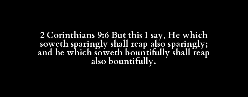 2 Corinthians 9:6 But this I say, He which soweth sparingly shall reap also sparingly; and he which soweth bountifully shall reap also bountifully.