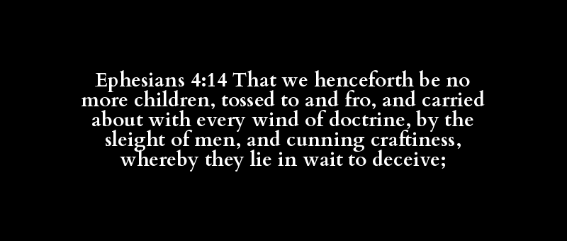 Ephesians 4:14 That we henceforth be no more children, tossed to and fro, and carried about with every wind of doctrine, by the sleight of men, and cunning craftiness, whereby they lie in wait to deceive;