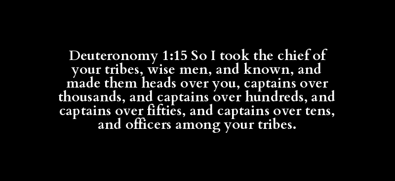 Deuteronomy 1:15 So I took the chief of your tribes, wise men, and known, and made them heads over you, captains over thousands, and captains over hundreds, and captains over fifties, and captains over tens, and officers among your tribes.