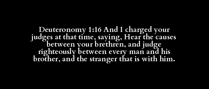 Deuteronomy 1:16 And I charged your judges at that time, saying, Hear the causes between your brethren, and judge righteously between every man and his brother, and the stranger that is with him.