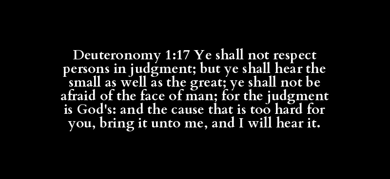 Deuteronomy 1:17 Ye shall not respect persons in judgment; but ye shall hear the small as well as the great; ye shall not be afraid of the face of man; for the judgment is God's: and the cause that is too hard for you, bring it unto me, and I will hear it.