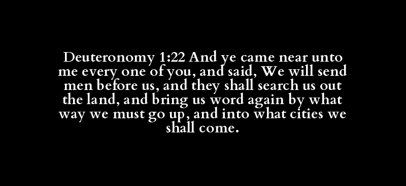 Deuteronomy 1:22 And ye came near unto me every one of you, and said, We will send men before us, and they shall search us out the land, and bring us word again by what way we must go up, and into what cities we shall come.