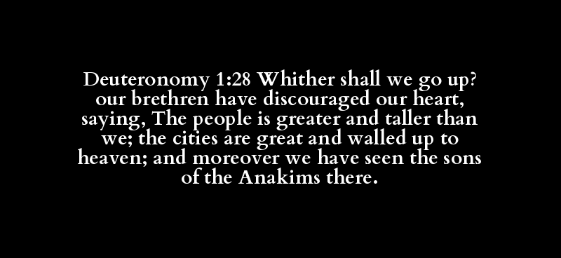 Deuteronomy 1:28 Whither shall we go up? our brethren have discouraged our heart, saying, The people is greater and taller than we; the cities are great and walled up to heaven; and moreover we have seen the sons of the Anakims there.