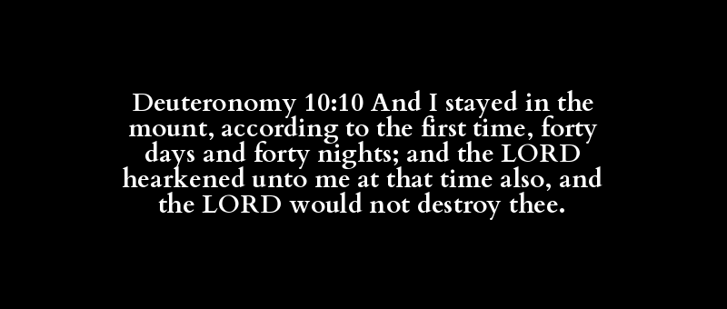 Deuteronomy 10:10 And I stayed in the mount, according to the first time, forty days and forty nights; and the LORD hearkened unto me at that time also, and the LORD would not destroy thee.
