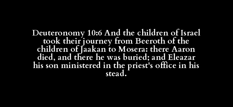 Deuteronomy 10:6 And the children of Israel took their journey from Beeroth of the children of Jaakan to Mosera: there Aaron died, and there he was buried; and Eleazar his son ministered in the priest's office in his stead.