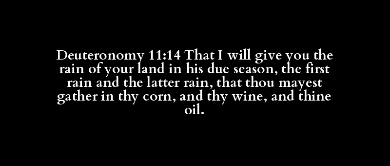 Deuteronomy 11:14 That I will give you the rain of your land in his due season, the first rain and the latter rain, that thou mayest gather in thy corn, and thy wine, and thine oil.