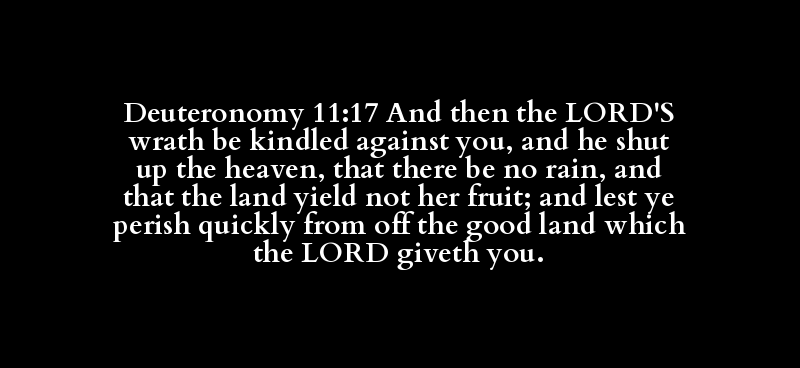 Deuteronomy 11:17 And then the LORD'S wrath be kindled against you, and he shut up the heaven, that there be no rain, and that the land yield not her fruit; and lest ye perish quickly from off the good land which the LORD giveth you.